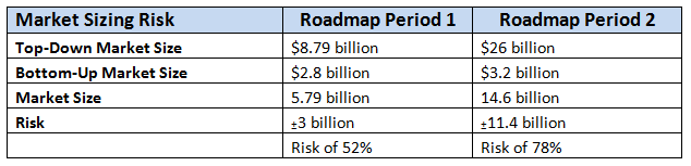 Risk: The market risk is computed by taking the top-down estimate and subtracting the market size from it. The risk percentage is just computed by taking the risk and dividing it by the market size. Don't worry, this is just an example of the template; your estimates will be much better.