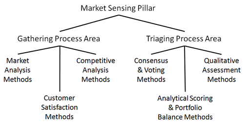 To help us accomplish this vision of market sensing, we divide the Market Sensing Pillar into two process areas of Market Evidence Gathering, and Market Evidence Triaging. Yes, these process areas can be thought of as CMMI Process Areas.